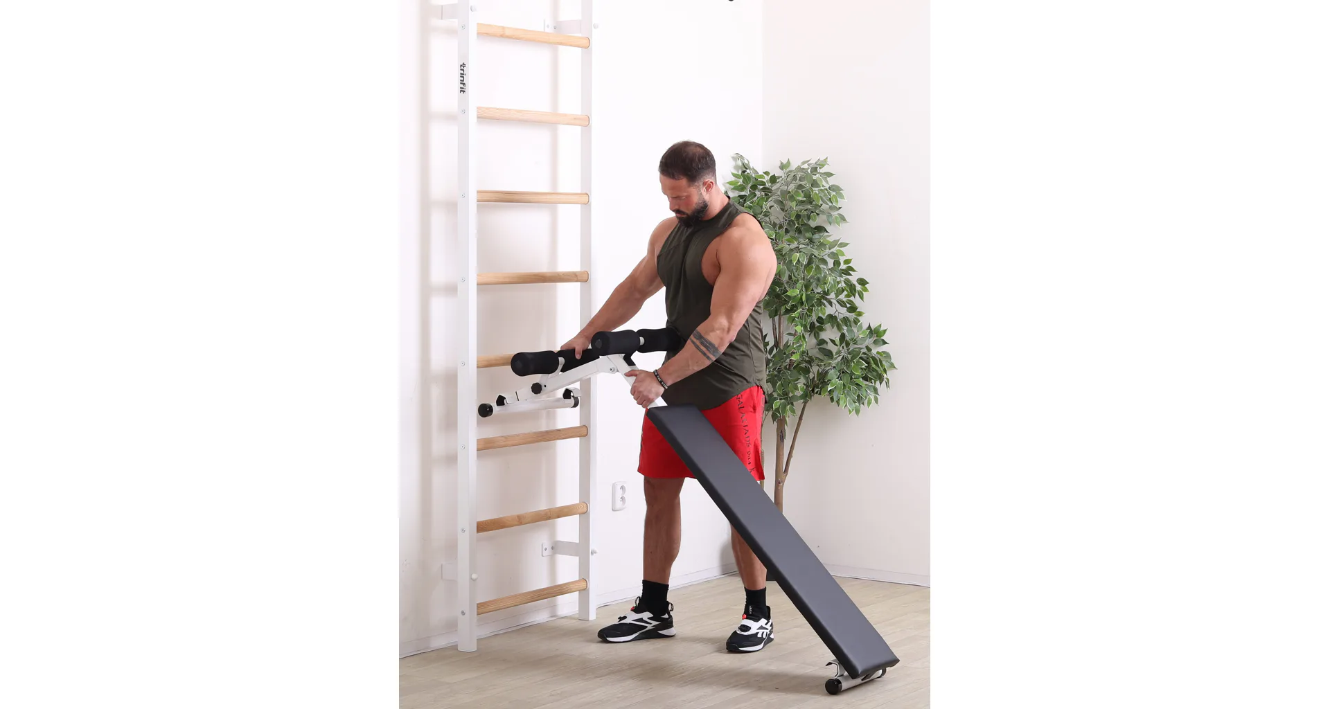 Závěsná lavice TRINFIT Elegance nabízí unikátní výhodu variabilního zavěšení do různých úhlů díky tomu, že ji můžete snadno upevnit na různých příčkách žebřin. To vám umožňuje přizpůsobit náklon lavice podle typu cvičení a intenzity, kterou preferujete.