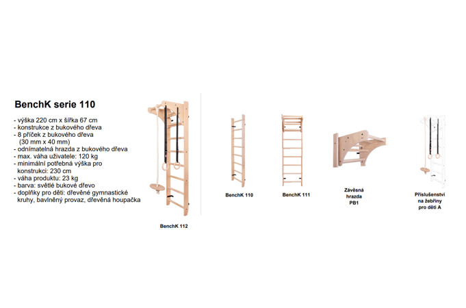 Žebřiny BenchK 110 s rozměry 220 x 67 cm jsou navrženy jak pro nejmladší sportovní nadšence, tak i teenagery či dospělé. Díky speciálním doplňkům, jako jsou gymnastické kruhy nebo lano s houpačkou, je možné trénovat děti formou zábavných her.