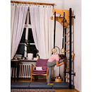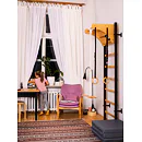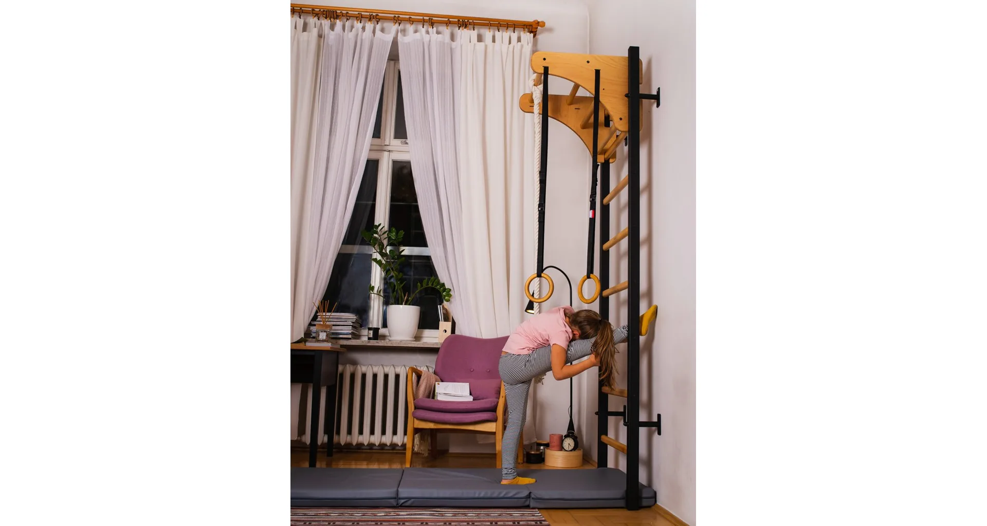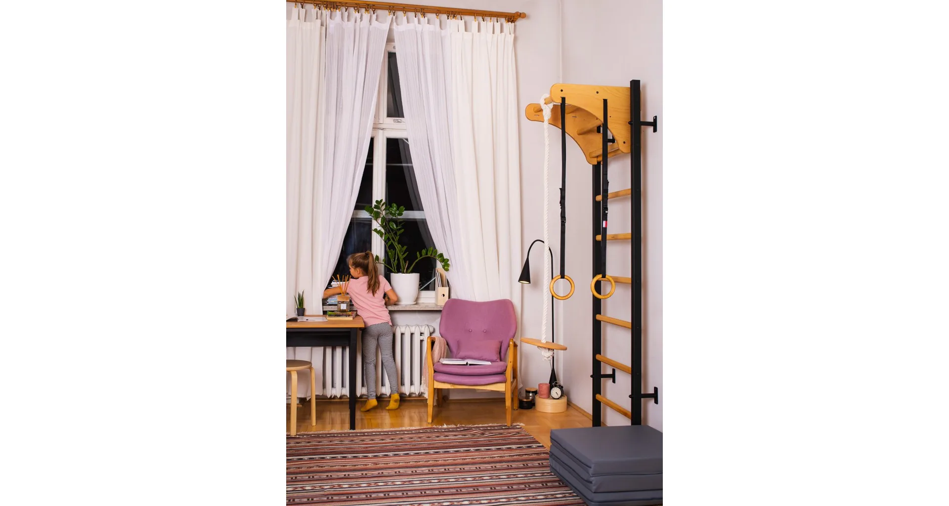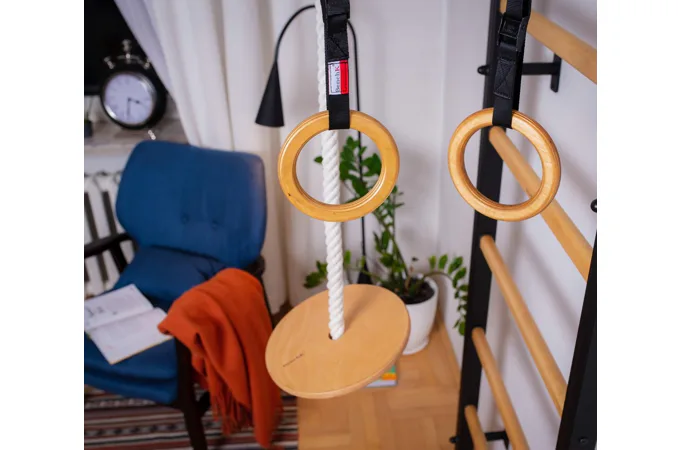 Vyobrazené komponenty nejsou součástí objednávky, ale je možné si je dokoupit. Jedná se o hrazdu, gymnastické kruhy a lano s houpačkou.