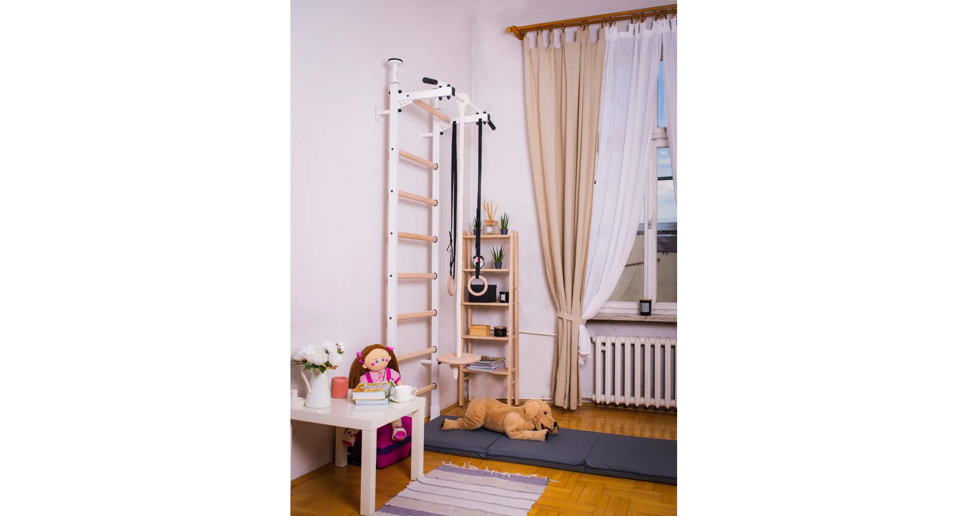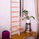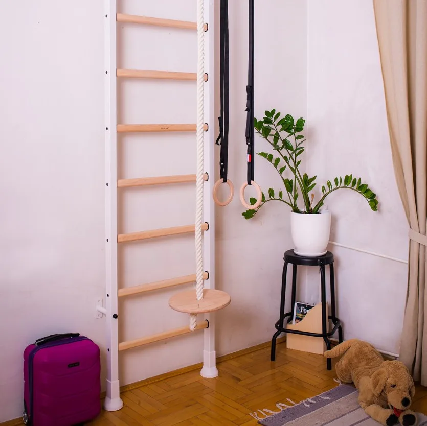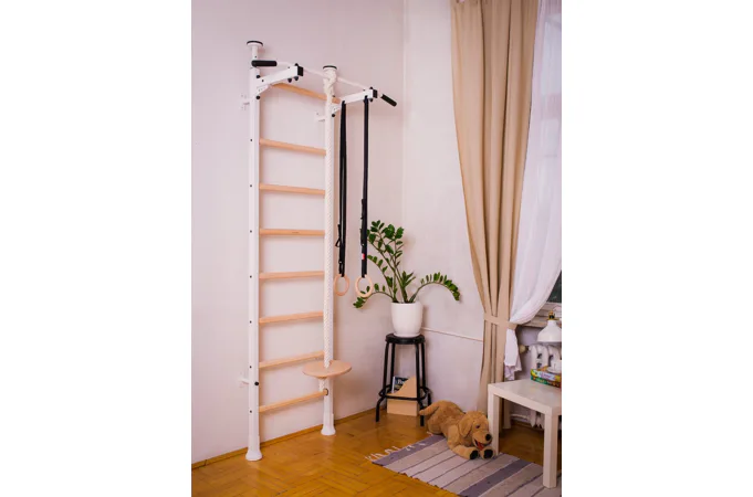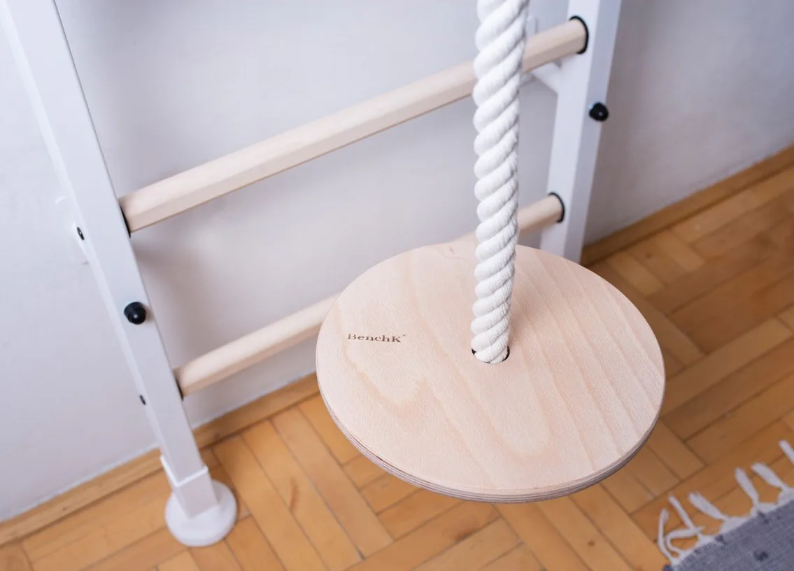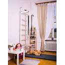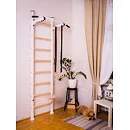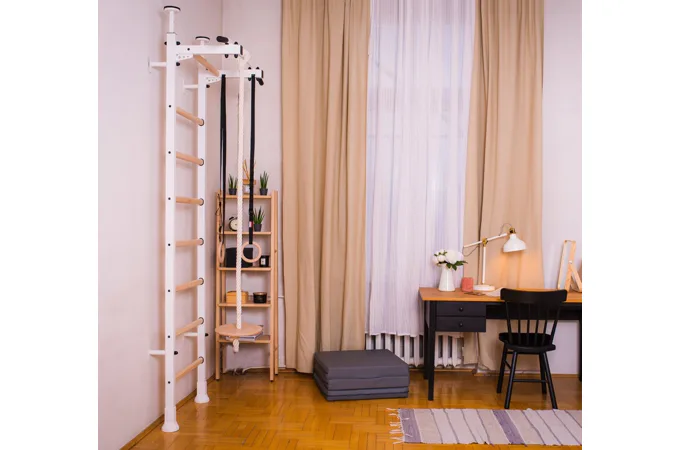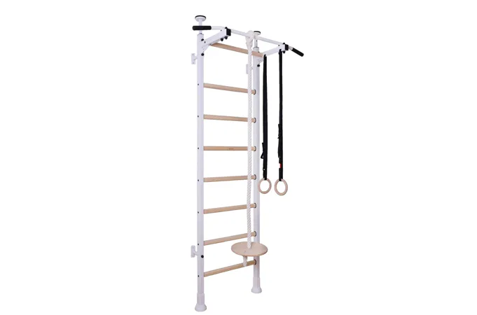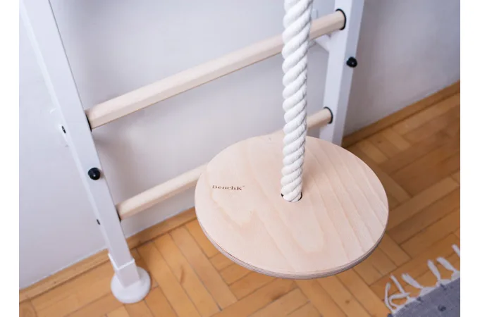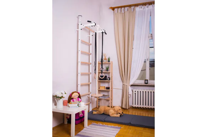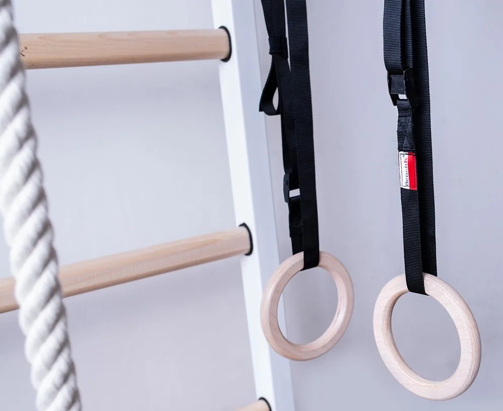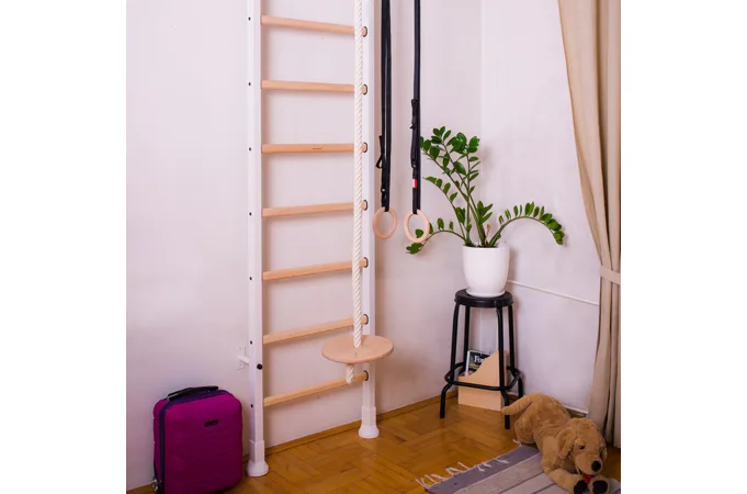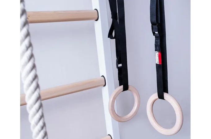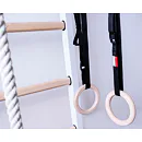Součástí žebřin BenchK 412 je kovová hrazda, díky které můžete posilovat horní část těla. Děti zase ocení gymnastické kruhy a závěsnou houpačku.