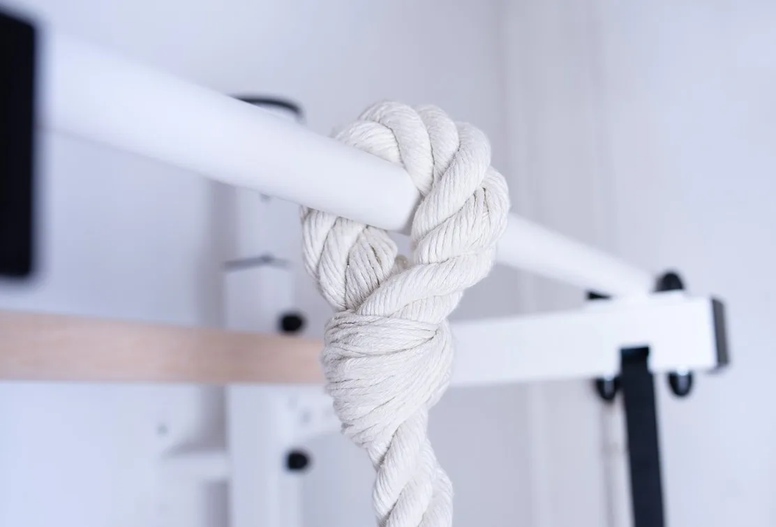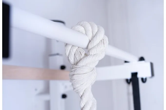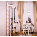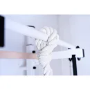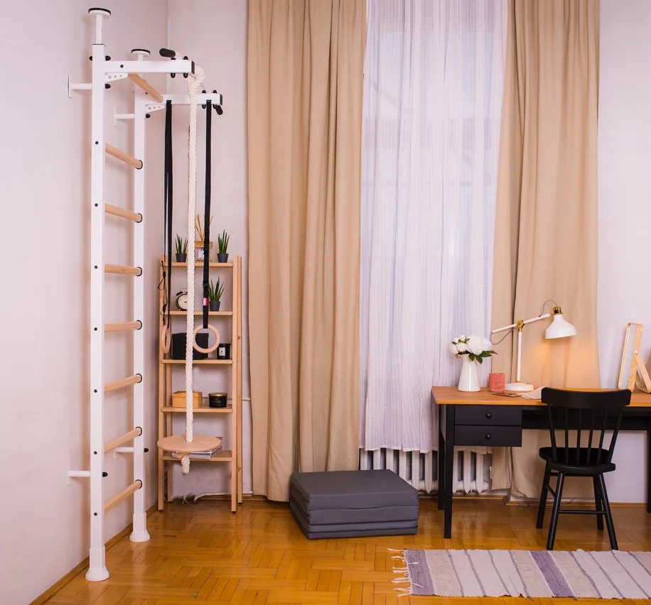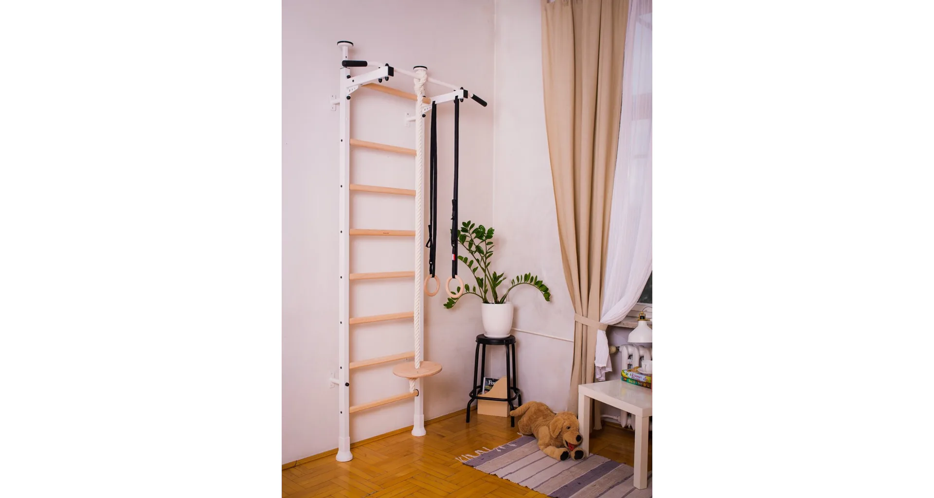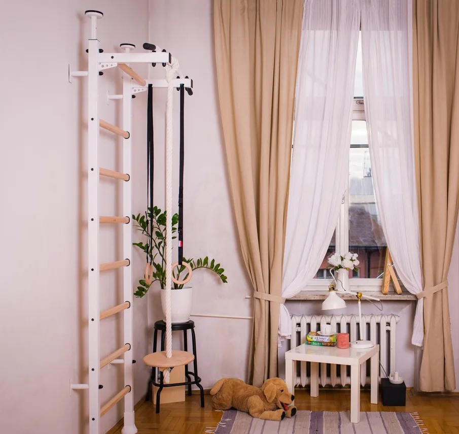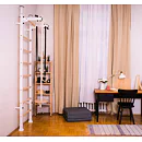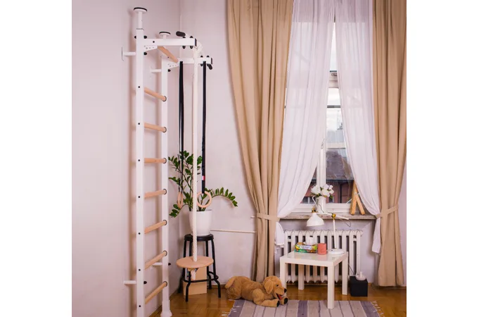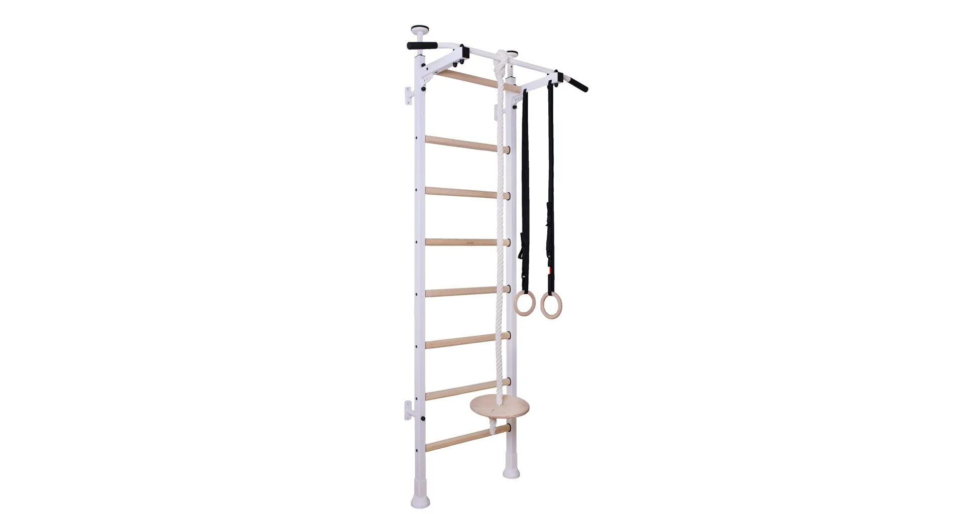 Součástí žebřin BenchK 412 je kovová hrazda, díky které můžete posilovat horní část těla. Děti zase ocení gymnastické kruhy a závěsnou houpačku.