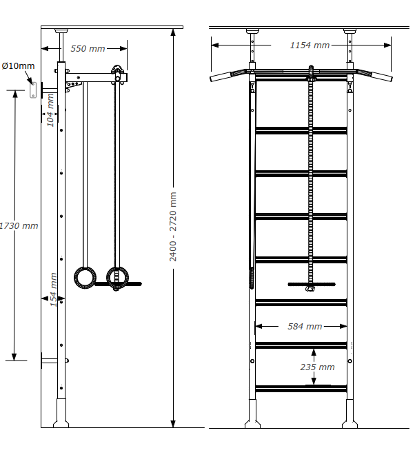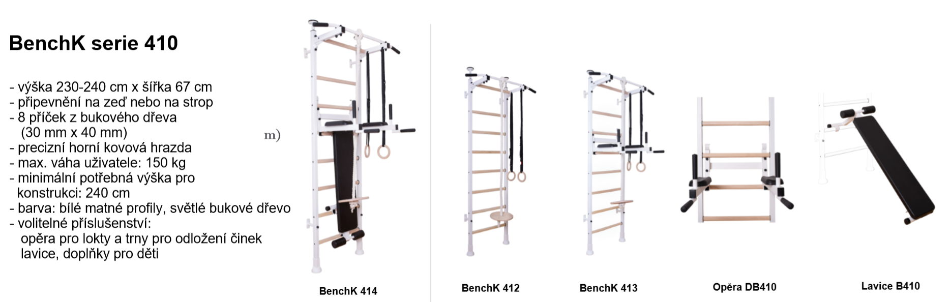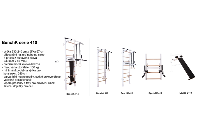 Vzpěrné žebřiny BenchK 412 jsou ideálním cvičícím nástrojem s kvalitním zpracováním a moderním designem. Jejich hlavním úkolem je inspirovat děti a dospělé k různým fyzickým aktivitám. Konstrukci lze připevnit do stěny nebo ji můžete zapřít o strop a upevnit bez vrtání (od 240 cm do 275 cm)