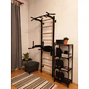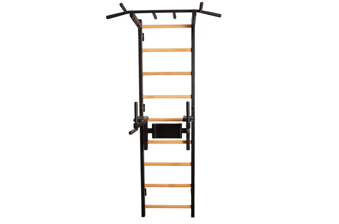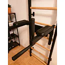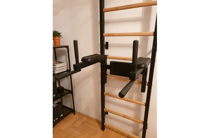 Kovová konstrukce žebřin je vyrobena z profilu 50 x 40 mm o tloušťce 2 mm. Oválné příčky z bukového dřeva s profilem 30 x 40 mm poskytují dokonalý úchop. Dřevo je ručně napuštěno olejem a nehrozí tak loupání laku. Hrazda o průměru 27,2 mm s protiskluzovými madly nabízí celkem šest různých úchopů. Bradla jsou připevněna ke 4 háčkům o tloušťce 4 mm s plstěnou podložkou a můžete je zavěsit za jakoukoliv příčku.