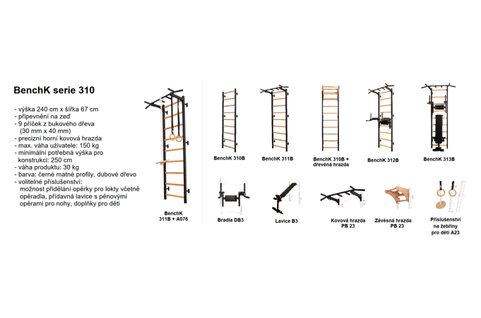 Žebřiny super. Hrazda i bradla skvělé. Nosnost je dle mého mnohem vyšší než je udáváno. Ukotveno do sádrokartonu rozpěrnými hmoždinkami a žebřiny se ani nehnou. Jen pozor, na jedné dřevěné příčce je gravírované logo BenchK... já si všiml až po montáži a náhodou mám příčku u země hlavou dolů :-) www.kozma.cz/files/benchk.jpg