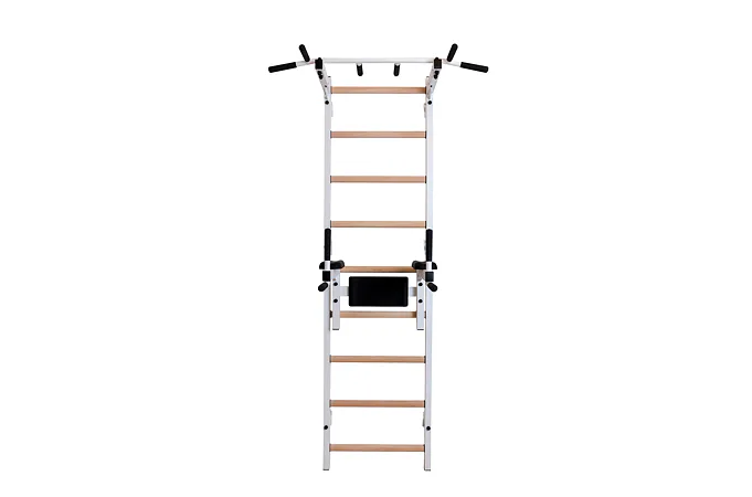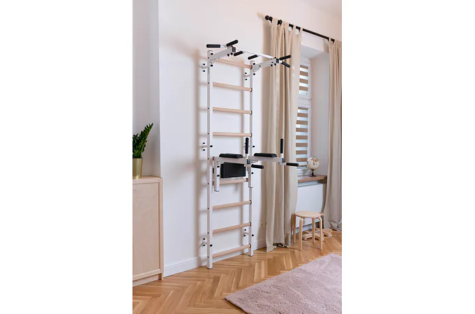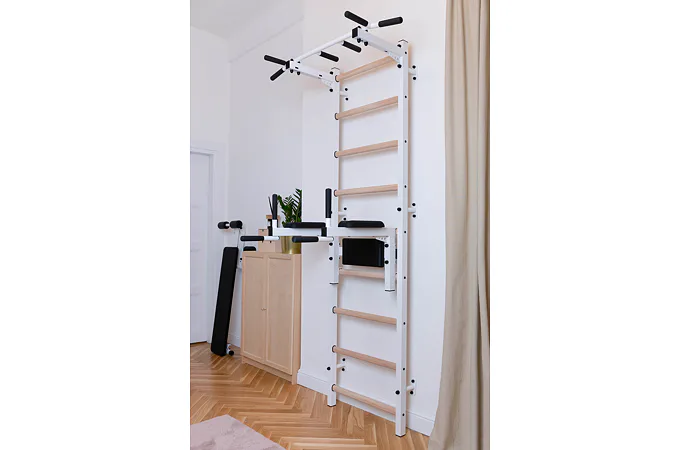 Kovová konstrukce žebřin je vyrobena z profilu 50 x 40 mm o tloušťce 2 mm. Oválné příčky z bukového dřeva s profilem 30 x 40 mm poskytují dokonalý úchop. Dřevo je ručně napuštěno olejem a nehrozí tak loupání laku. Hrazda o průměru 27,2 mm s protiskluzovými madly nabízí celkem šest různých úchopů. Bradla jsou připevněna ke 4 háčkům o tloušťce 4 mm s plstěnou podložkou a můžete je zavěsit za jakoukoliv příčku.