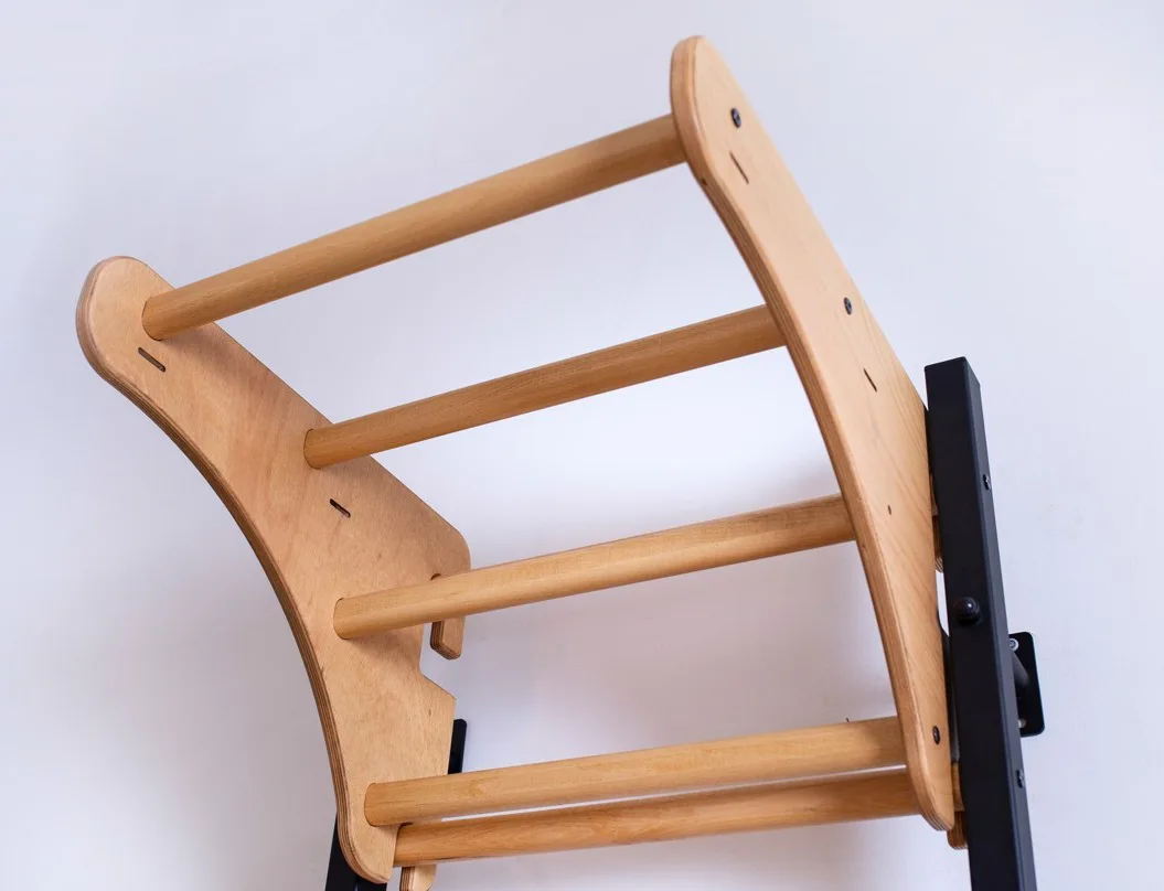 Konstrukce je vyrobena z odolného kovu a příčky z bukového dřeva. Oválné příčky s profilem 30 x 40 mm poskytují dokonalý úchop. Dřevo je ručně napuštěno olejem a nehrozí tak loupání laku. Žebřiny jsou nenáročné na prostor a vejdou se do jakékoli místnosti.