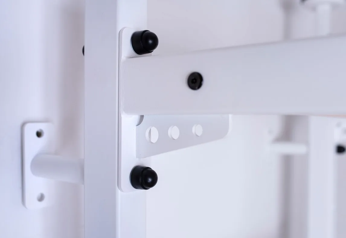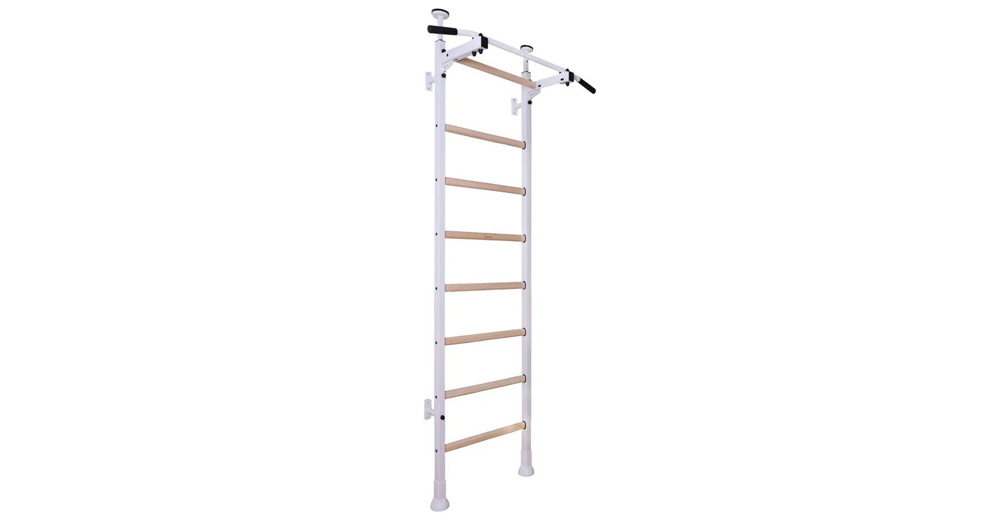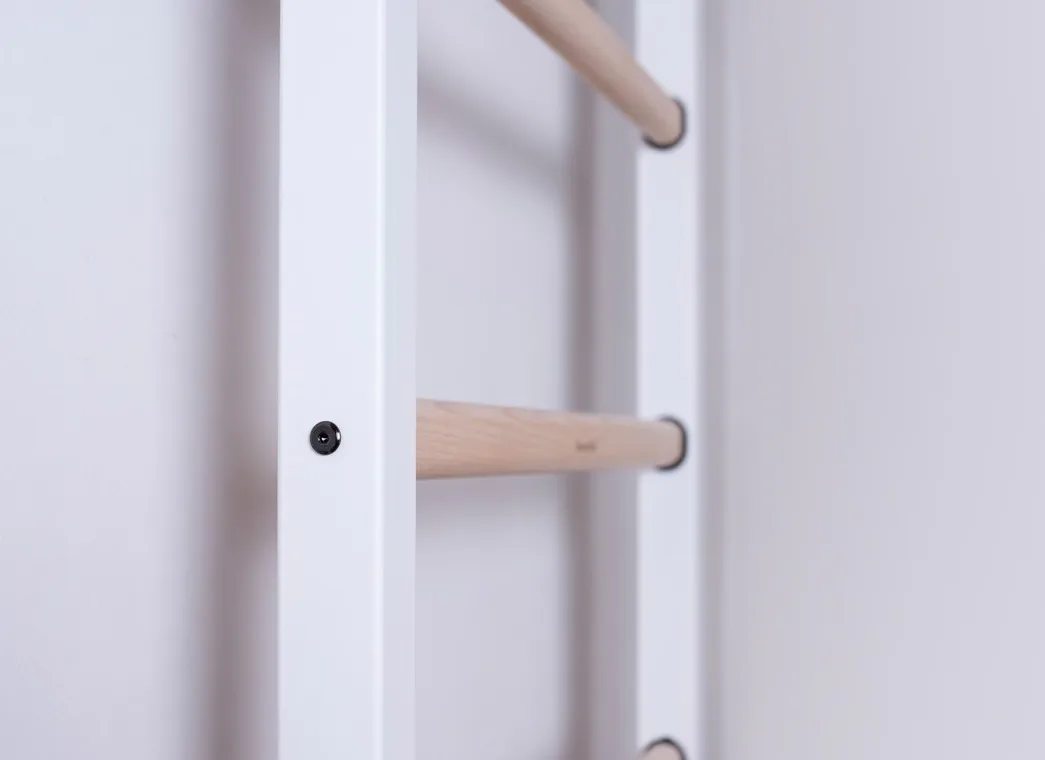 Masivní konstrukce je vyrobena z odolného kovu a příčky z bukového dřeva. Oválné příčky s profilem 30 x 40 mm poskytují dokonalý úchop. Dřevo je ručně napuštěno olejem a nehrozí tak loupání laku. Žebřiny jsou nenáročné na prostor a vejdou se do jakékoli místnosti se stropem 240 cm vysokým.