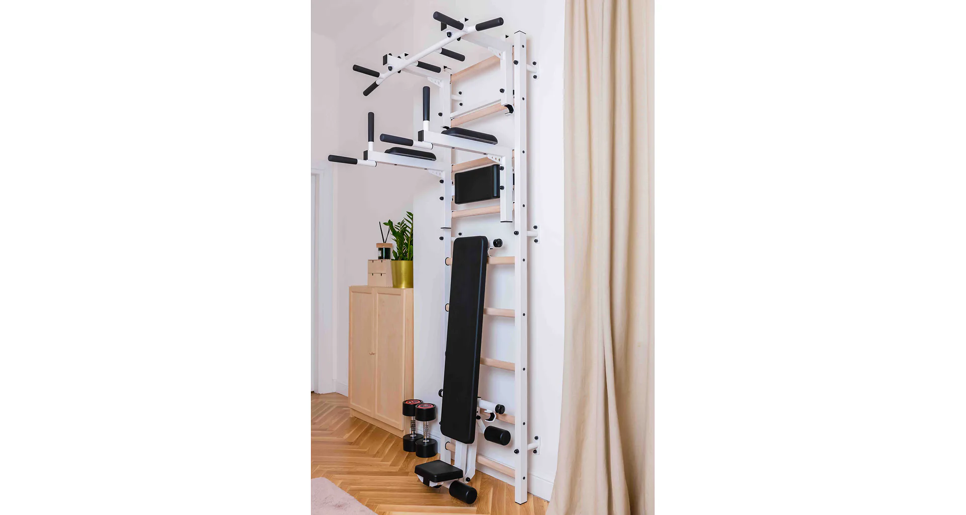 Žebřiny s rozměry 240 x 67 cm s hrazdou, bradly a lavičkou BenchK 733W jsou ideálním cvičícím nástrojem s kvalitním zpracováním a moderním designem. Jedná se o kombinaci žebřiny BenchK 733W, kovové hrazdy BenchK PB3W, bradel BenchK DB1W a lavičky BenchK B1W.