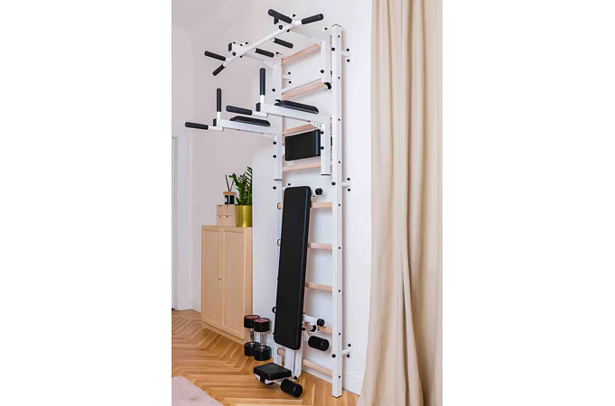 Žebřiny s rozměry 240 x 67 cm s hrazdou, bradly a lavičkou BenchK 733W jsou ideálním cvičícím nástrojem s kvalitním zpracováním a moderním designem. Jedná se o kombinaci žebřiny BenchK 733W, kovové hrazdy BenchK PB3W, bradel BenchK DB1W a lavičky BenchK B1W.